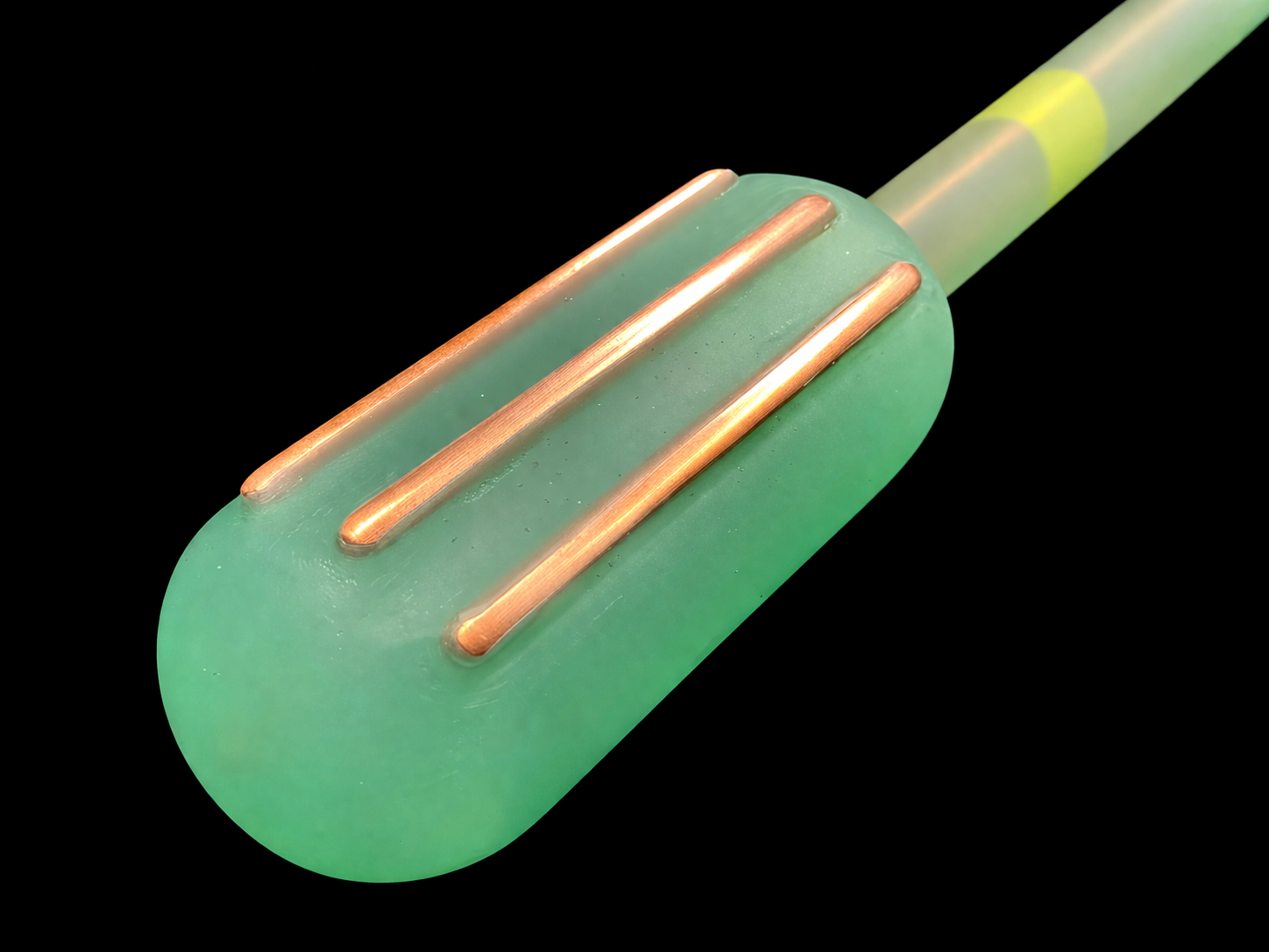 The probe features a smooth, contoured polymer shell over a stainless steel internal shaft for durability and controlled insertion. Three longitudinal copper electrodes are exposed at the probe head and extend internally along the length of the device.